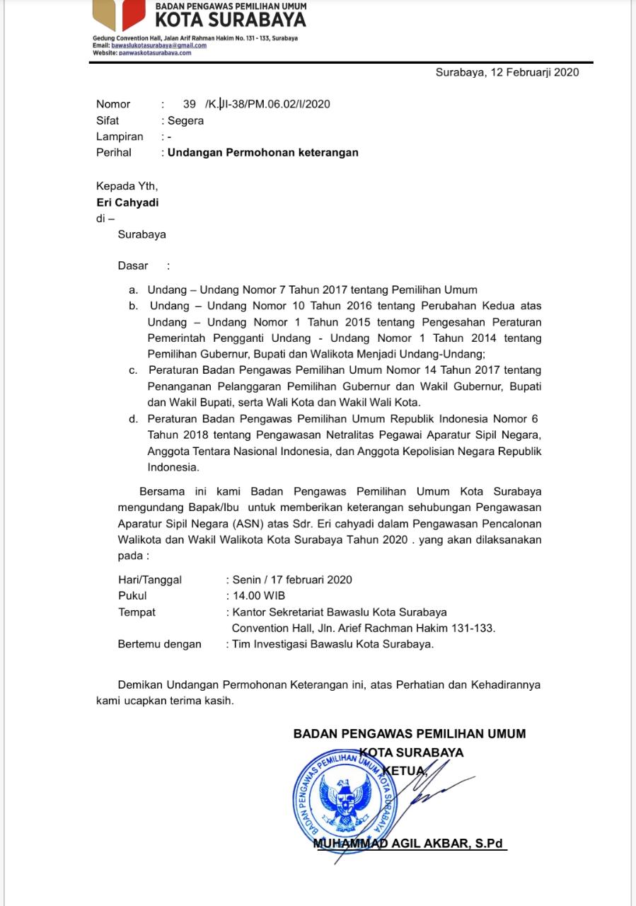 Ketua Bawaslu Surabaya Agil Akbar mengatakan, pemanggilan ini sebagai langkah pengawasan terhadap netralitas Aparatur Sipil Negara (ASN) dalam pilkada.