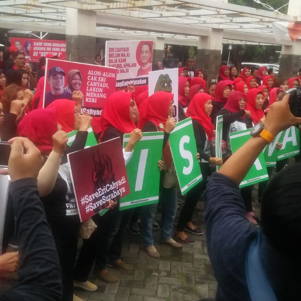 Selain itu, ada ratusan ibu-ibu relawan Eri Cahyadi yang menggelar aksi dukungan terhadap Eri di depan Bawaslu. Dengan mengenakan sergam hitam serta kerudung merah, kelompok yang mengaku mendukung Eri Cahyadi tersebut juga membawa beragam poster berisi dukungan semangat.