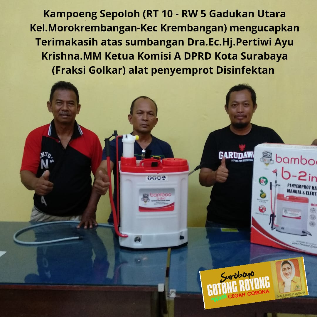 JURNALBERITA.ID – SURABAYA, Sebagai anggota legislatif yang memangku jabatan sebagai Ketua Komisi A DPRD kota Surabaya dari fraksi partai Gokar tidak mengendorkan semangatnya membantu warga Surabaya guna melawan pandemi Covid-19. Ayu begitu disapa warga Surabaya berjuang bersama warga dengan membantu mengirimkan alat semprot disinfektan di lingkungan warga Kampung Sepoloh RT10 dan RT11, RW 05 Kelurahan Morokrembangan, Kecamatan Krembangan kota Surabaya.