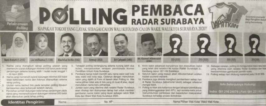 JURNALBERITA.ID – SURABAYA, Pemilihan kepala daerah (Pilkada) kota Surabaya yang konon kabarnya akan mengalami penundaan tahapan Pilkada 2020 oleh penyelenggaran komite pemilihan umum (KPU). Penundaan tahapan pemilu itu, lantaran merebaknya kasus wabah virus corona secara global. Harian media cetak Radar Surabaya tetap konsisten melakukan penjaringan jajak pendapat (Polling) terhadap responden pembacanya ditengah pandemi Covid-19. Polling pembaca Radar Surabaya terkait calon Walikota dan Wakil Walikota Surabaya 2020, yang dibuka untuk publik dilakukan selama satu bulan, terhitung sejak 1 April hingga tanggal 30 April 2020.