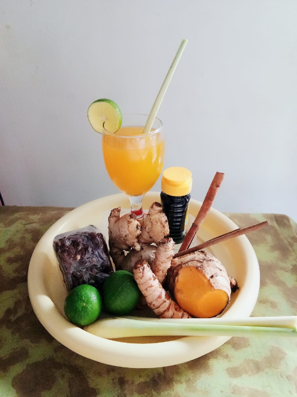 Temulawak, Kunir, Sereh, Jeruk nipis, Gula merah dan Madu.