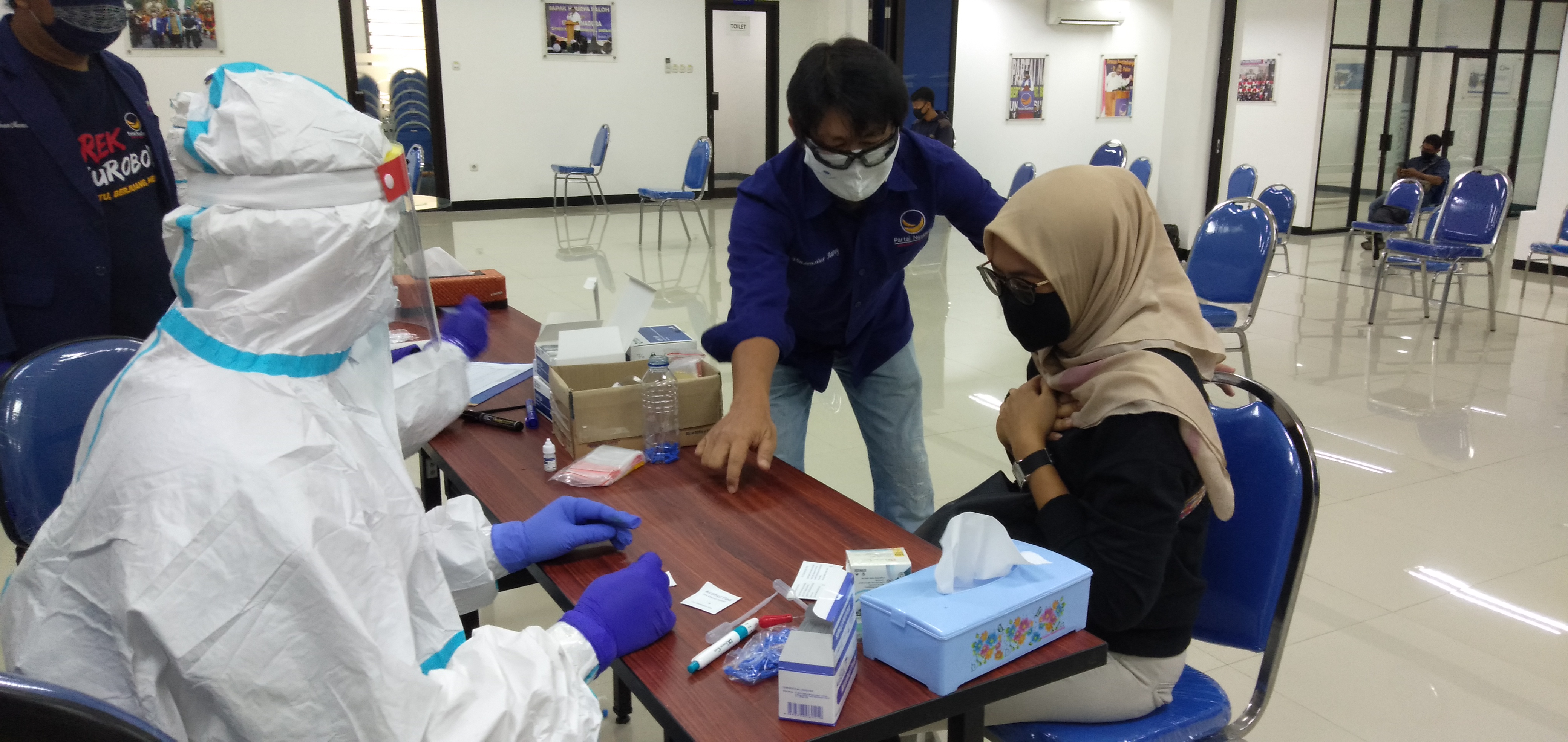 Selain para jurnalis, rapid test juga dilakukan terhadap kader dan pengurus DPW Partai NasDem yang kesehariannya di lapangan, seperti membagi sembako, penyemprotan disinfektan di kecamatan dan lain-lain.