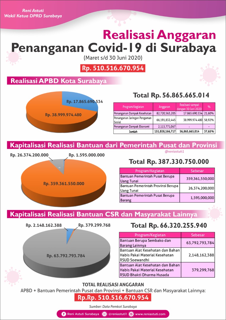 “Ya jadi total realisasi yang bersumber dari APBD Surabaya Rp 151.028.166.717,- anggaran yang disiapkan namun hingga Juni 2020 baru terserap sekitar Rp 56.865.665.014,- atau 37,65 persen dari anggaran yang disiapkan Pemkot Surabaya,” urainya.