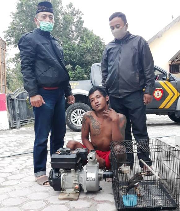 Tersangka pencurian pompa air dan Burung Jalak saat diamankan Polisi setempat (Y4N)
