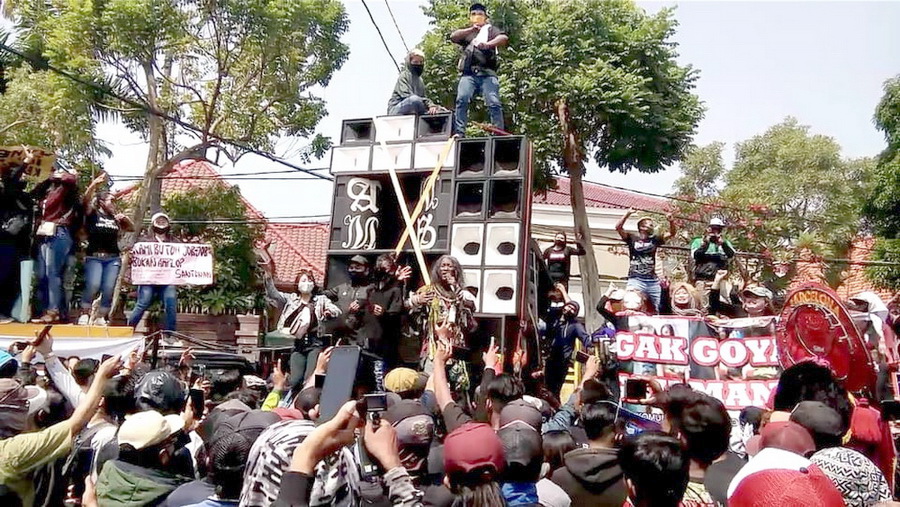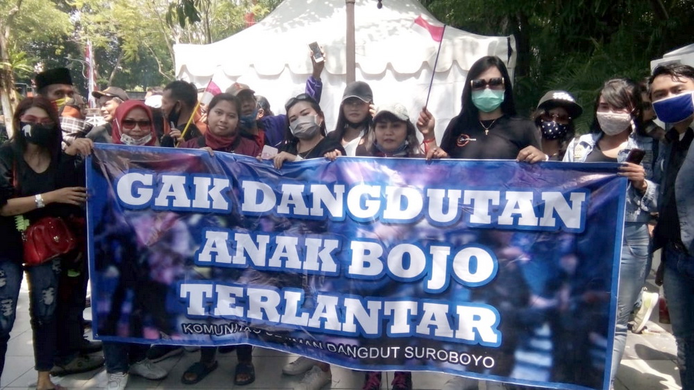 Aksi mereka menuntut Walikota Surabaya Tri Rismaharini untuk memberikan ijin pada pekerja seni, agar bisa kembali berkarya dan bekerja di tempat orang yang mengundang hajatan atau resepsi pernikahan.