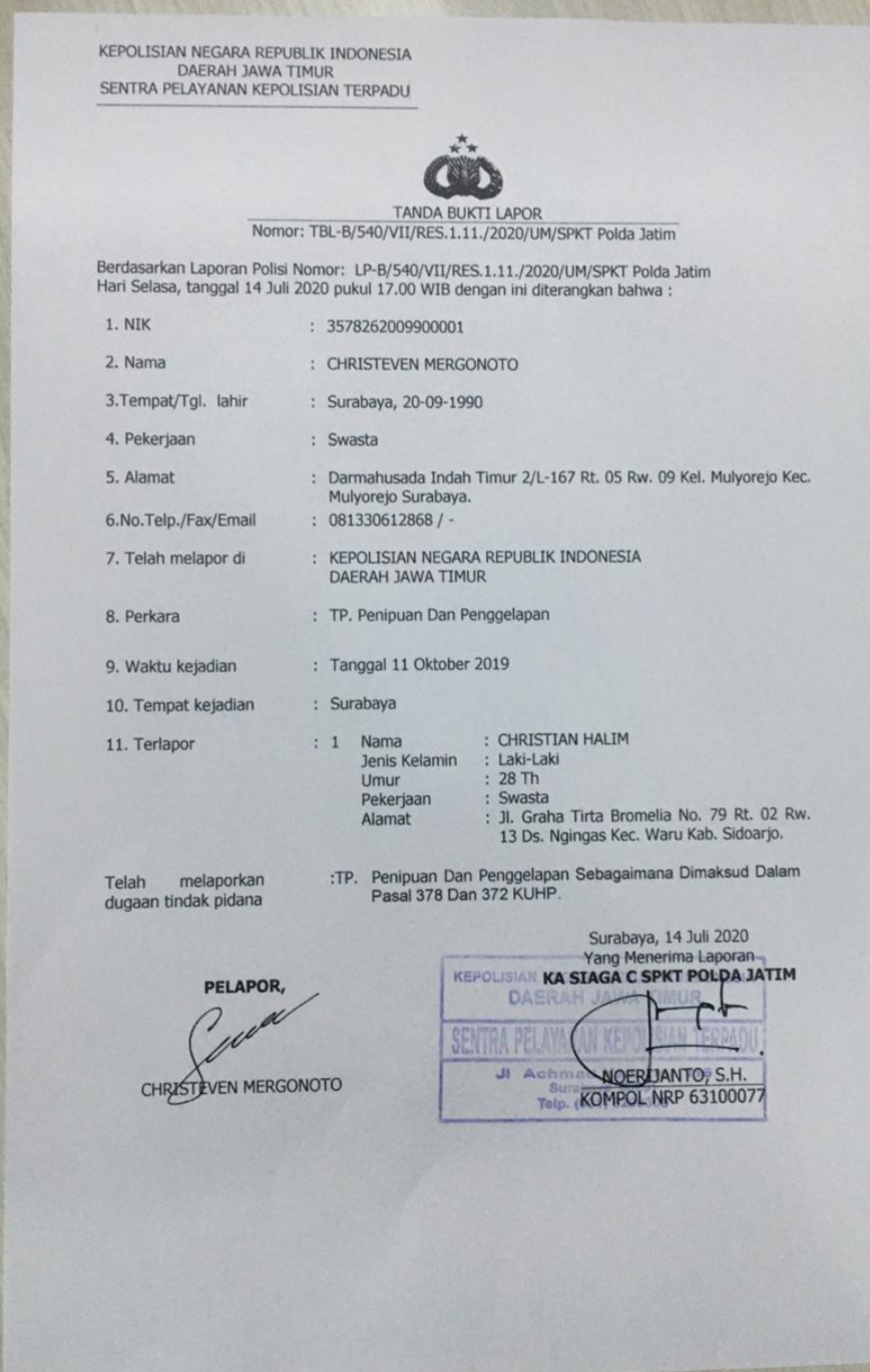 Kasus ini merupakan tindak lanjut dari laporan Christeven Mergonoto terhadap Christian Halim ke Polda Jatim dengan nomor laporan LP-B/ 540/VII/RES1.11/2020/UM/SPKT atas dugaan penipuan dan penggelapan sesuai pasal 278 dan 372 KUHP.