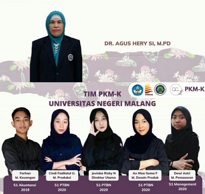 Tim PKM-K Universitas Negeri Malang hadir dengan inovasi terbaru upcycle busana dan limbah tekstil yang berhasil mendapatkan pendanaan dari ajang Program Kreativitas Mahasiswa yang didanai langsung oleh Kemendikbud Ristek pada tahun 2021, Tim kami beranggotakan mahasiswa Fakultas Teknik UM yang berkolaborasi dengan mahasiswa Fakultas Ekonomi UM, Mereka adalah Jovinka Rizky Nayoan , Anisa Gema Fitri, dan Cindi Fadilatul Umaroh dari Prodi Pendidikan Tata Busana Serta Dewi Astri Maharani dari Prodi Manajemen dan Farhan dari Prodi Akuntansi yang dibimbing oleh Dr. Agus Hery SI, M.Pd selaku dosen pengempu mata kuliah Penulisan Karya Ilmiah, serta Koorprodi S1 Pendidikan Tata Busana Jurusan Teknologi Industri Fakultas Teknik Universitas Negeri Malang.