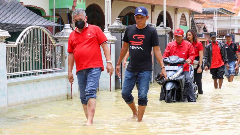 JURNALBERITA.ID-LAMONGAN, Ketua DPRD Jawa Timur, Kusnadi bersama kader PDI Perjuangan turun langsung Desa Ketapangtelu, Kecamatan Karangbinangun Lamongan yang terendam banjir akibat luapan bengawan Njero.