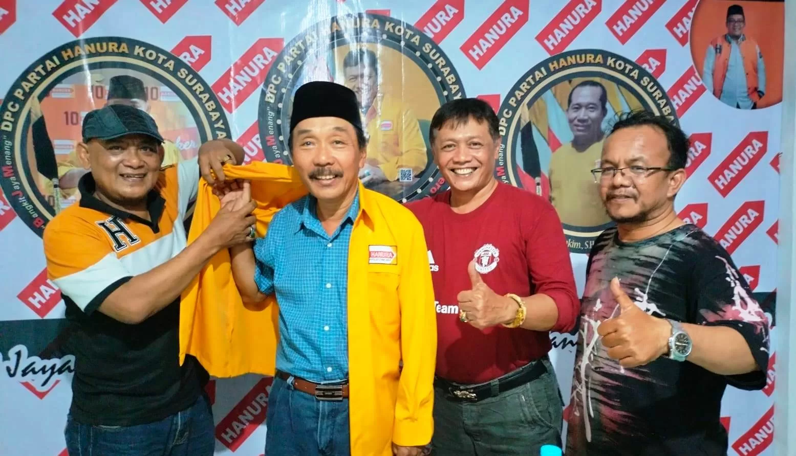 JURNALBERITA.ID – SURABAYA, Mantan Kepala Badan Kesatuan Bangsa dan Politik (Bakesbangpol) Pemerintah Kota (Pemkot) Surabaya resmi mengenakan jaket Hanura (nomor 10). Pengenakan jaket partai Hanura ini langsung dipasangkan Ketua DPC Partai Hanura kota Surabaya, R. Edi Rachmat, SE, MM kepada Soemarno, SH, M.Hum (mantan Kepala Bakesbangpol, red) kota Surabaya yang sangat familiar dengan lingkup pemerintah kota Surabaya.
