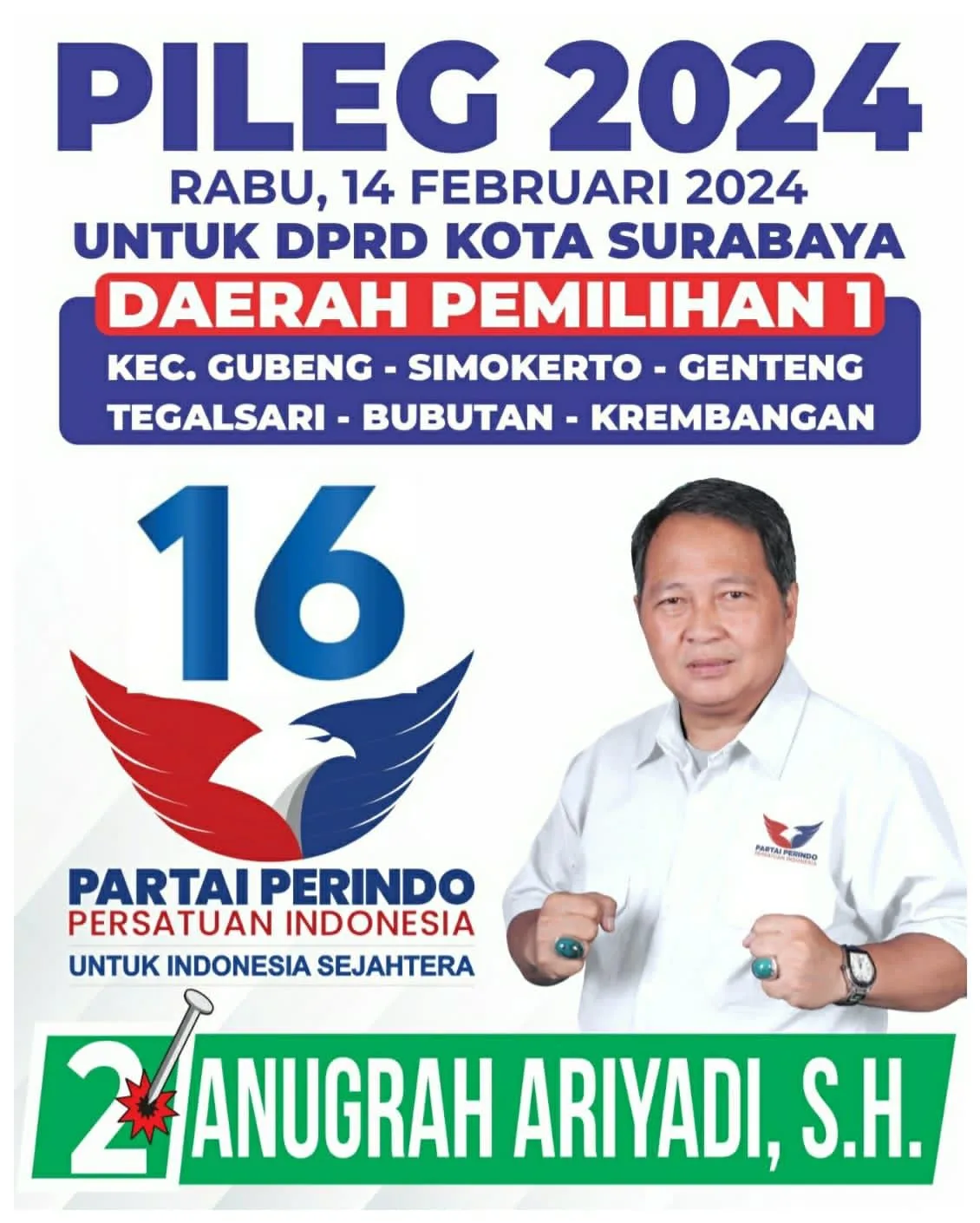 “Kami sekeluarga menyampaikan matur nuwun atas segala bentuk pengorbanan dan langkah perjuangan bapak ibu dalam mendukung dan mendoakan saya untuk kembali menjabat sebagai wakil mereka di kursi legislatif DPRD Kota Surabaya periode 2024-2029 nanti dari Partai Perindo,” kata Anugrah Ariyadi.