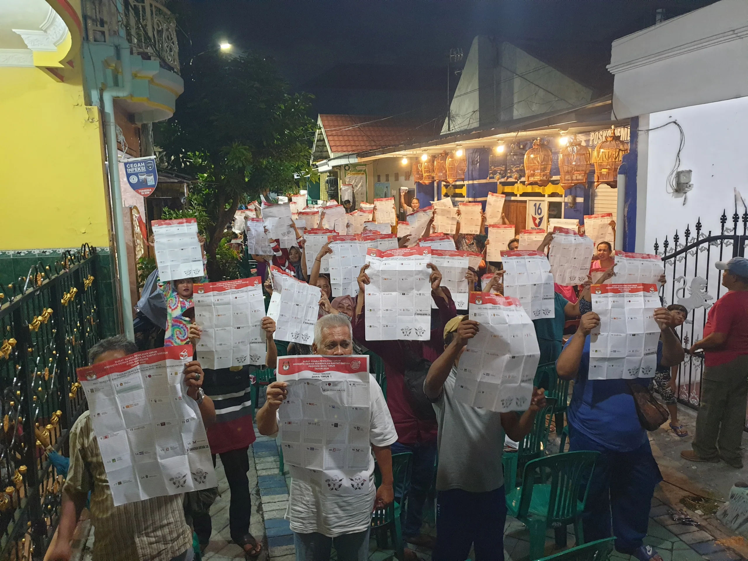 “Siap…..siap kami siap memenangkan pak Anugrah Ariyadi..,coblos..no 2 ..Anugrah Ariyadi, SH Partai Perindo no 16, coblos Ganjar-Mahfud untuk presiden,” ucap para warga sambil membawa contoh lembar surat suara.