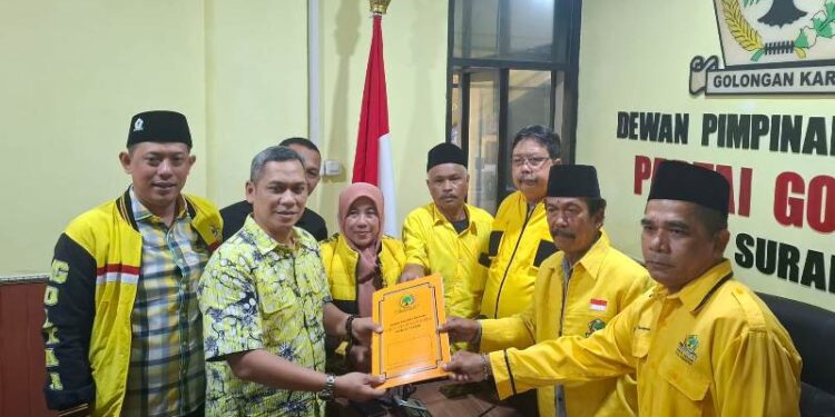 dr Akmarawita Kadir saat menyerahkan berkas pencalonan dirinya sebagai Ketua DPD Partai Golkar Surabaya yang diterima oleh Drs Asrofi selaku Ketua Steering Committee Musda XI Partai Golkar (FOTO: *Istimewa/LAM)